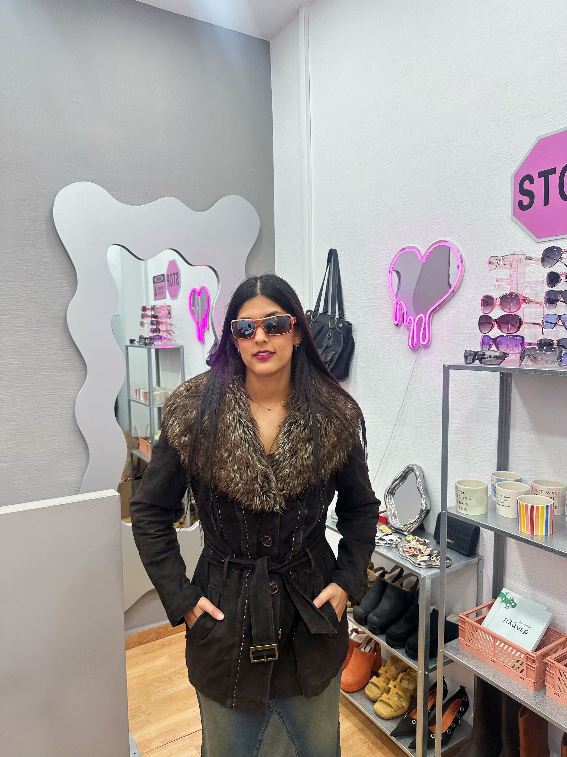 Belted leather coat with removable fur collar